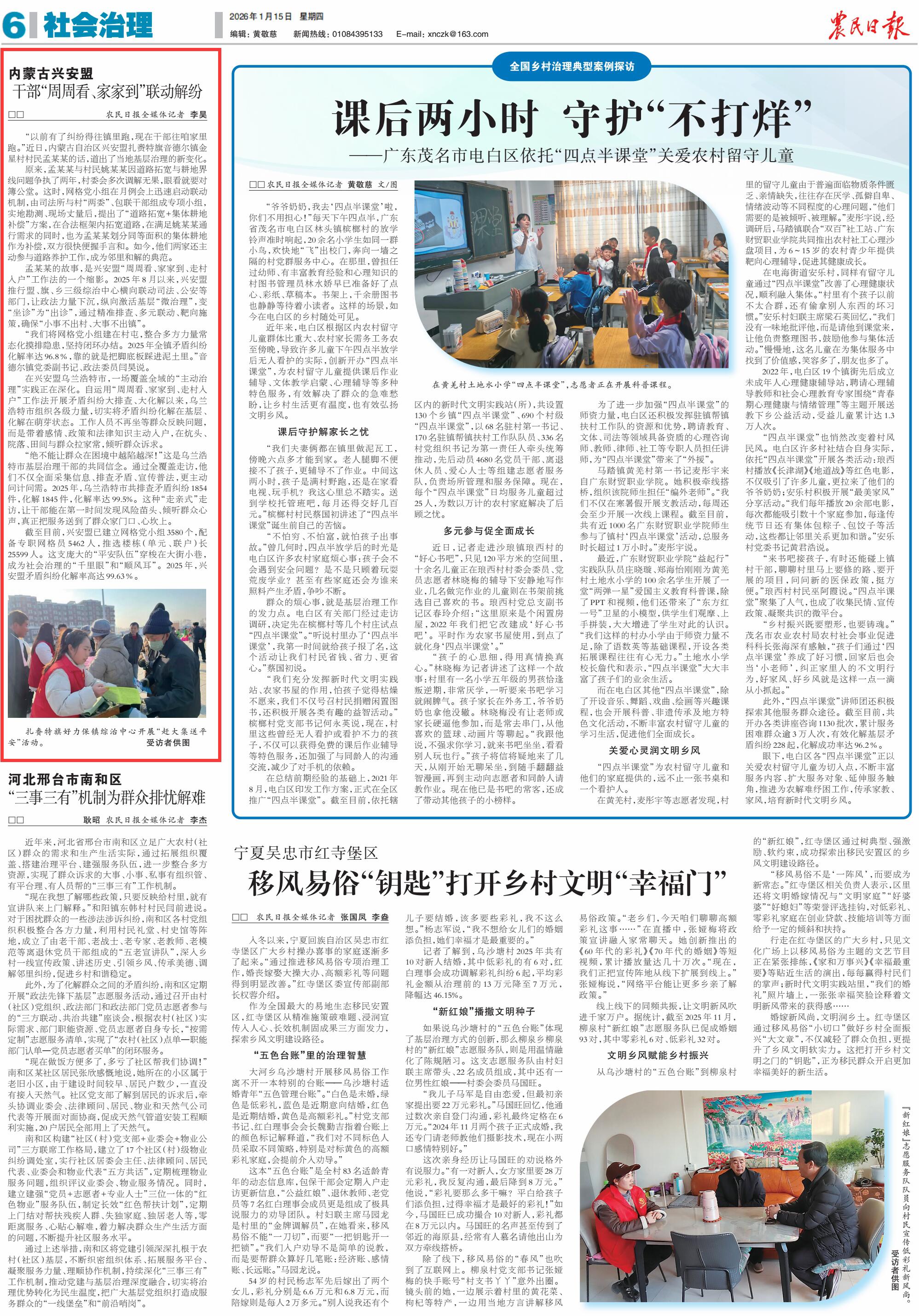 2026年1月15日,《農(nóng)民日報(bào)》第6版刊發(fā)題為《內(nèi)蒙古興安盟 干部“周周看、家家到”聯(lián)動(dòng)解紛》的文章,報(bào)道了2025年8月以來,興安盟推行盟、旗、鄉(xiāng)三級綜治中心橫向聯(lián)動(dòng)司法、公安等部門,讓政法力量下沉,縱向激活基層“微治理”,變“坐診”為“出診”,通過精準(zhǔn)排查、多元聯(lián)動(dòng)、靶向施策,確?!靶∈虏怀龃?、大事不出鎮(zhèn)”。