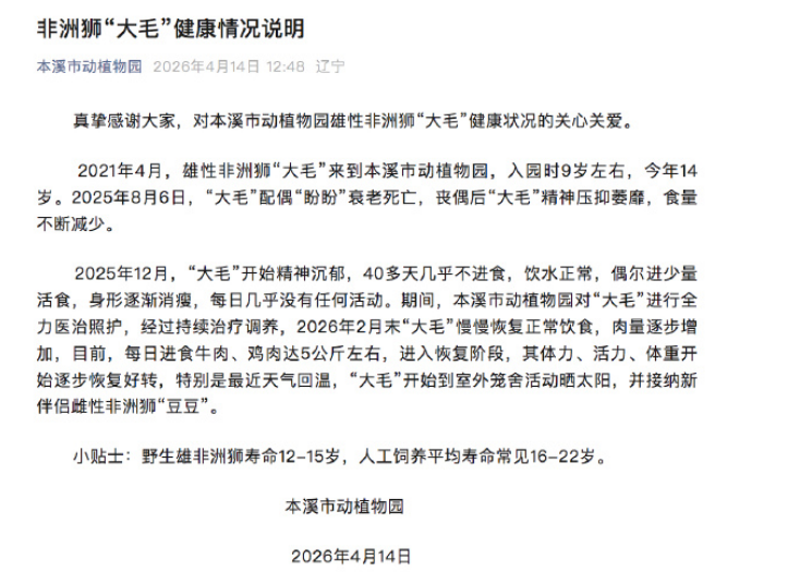 4月14日,遼寧本溪市動植物園發(fā)布情況說明稱,2021年4月,雄性非洲獅“大毛”來到本溪市動植物園,入園時9歲左右,今年14歲。2025年8月6日,“大毛”配偶“盼盼”衰老死亡,喪偶后“大毛”精神壓抑萎靡,食量不斷減少。2025年12月,“大毛”開始精神沉郁,40多天幾乎不進(jìn)食,飲水正常,偶爾進(jìn)少量活食,身形逐漸消瘦,每日幾乎沒有任何活動。