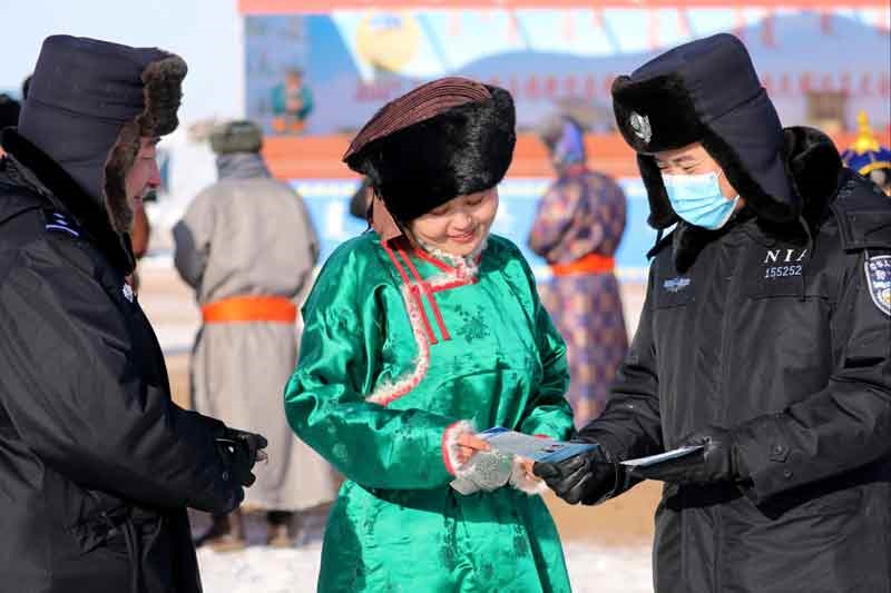 錫林郭勒邊境管理支隊(duì)達(dá)來、洪格爾、巴音都蘭等3 個(gè)邊境派出所共派出20多名警力,對于前來參加那達(dá)慕的人們進(jìn)行嚴(yán)格檢查,并向牧民群眾講解當(dāng)前面臨的新冠肺炎疫情防控形勢,發(fā)放宣傳冊。(內(nèi)蒙古日報(bào)記者 巴依斯古楞 攝影報(bào)道)