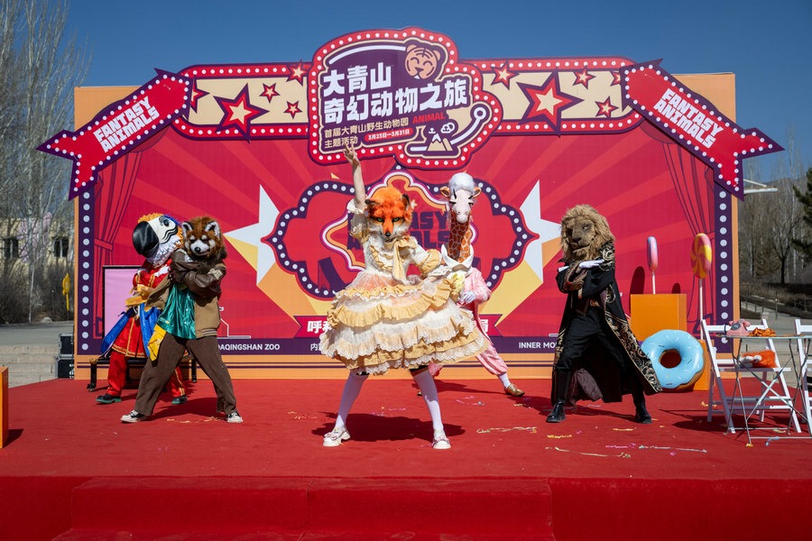 3月22日上午,在內(nèi)蒙古呼和浩特大青山野生動物園里,5只動物人偶正在為23日舉行的國內(nèi)大型動物主題互動巡游偶劇《奇幻動物城》彩排。