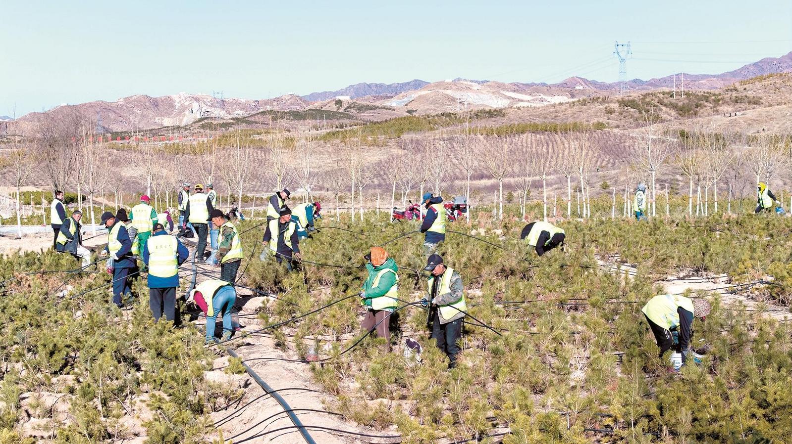 3月16日,包頭市防沙治沙大青山南坡綠化提質增效笸籮鋪項目現場,工作人員在鋪設節(jié)水灌溉管道。