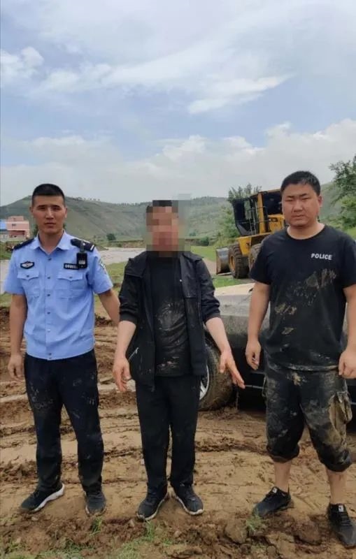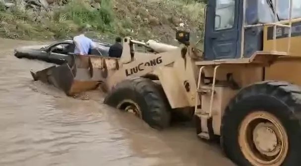 洪水還在上漲,經(jīng)研判分析,洪水仍在可控范圍內(nèi),為減少損失,兩位民警再次冒著生命危險,同裝載機(jī)一同下水,用繩索系牢越野車,將被困越野車拖上岸邊。