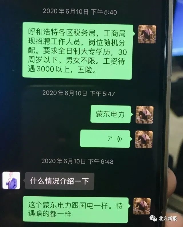 “呼和浩特各區(qū)消防大隊招聘辦公室內勤人員,工資待遇3500元左右?!薄案咚俳痪羰兄ш?一支隊)輔警,工資和五險一金,4200元?!薄昂艉秃铺馗鲄^(qū)稅務局、工商局現(xiàn)招聘工作人員,崗位隨機分配?!薄昂艉秃铺貗D幼保健院招聘護士,大專學歷”……記者在民警繳獲的程某某的手機上看到,6月8日以來,程某某和趙某某的聊天記錄中,發(fā)送了多條諸如此類的招聘信息。