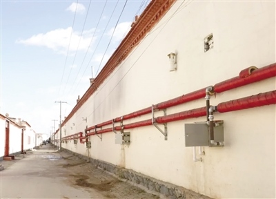 在臺閣牧鎮(zhèn)沙家營村,記者看到供熱管網(wǎng)改造施工時(shí)開挖的街巷已完成路面硬化;換熱站內(nèi)運(yùn)轉(zhuǎn)的機(jī)器隆隆作響,輸送熱源的管道摸起來十分燙手;在成排的居民房屋后墻整齊地安裝了包裹保溫材料的供熱管道和計(jì)量表箱,暖氣經(jīng)由這些管道輸送到各家各戶。