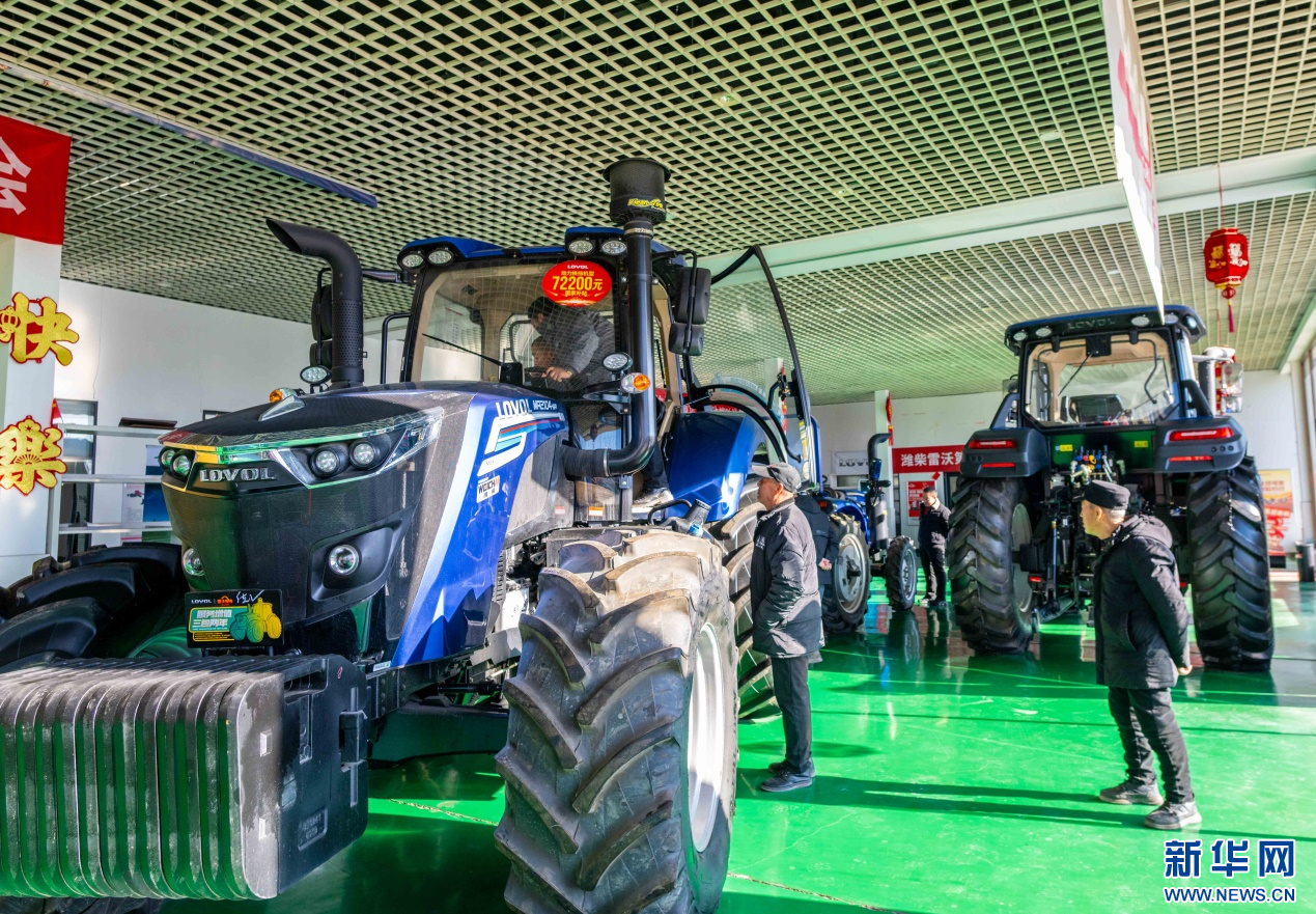 ??2月18日,在位于呼和浩特市玉泉區(qū)的一家農(nóng)機(jī)設(shè)備公司展銷大廳,農(nóng)戶在試駕拖拉機(jī)。新華網(wǎng)發(fā)(丁根厚 攝)