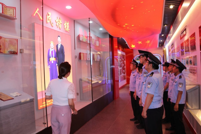 習(xí)近平新時代中國特色社會主義思想實(shí)踐基地由四子王旗委政府于2021年5月建成,總面積460平米,展廳內(nèi)展出圖片241張、文字展板34塊、視頻資料12個,分黨史學(xué)習(xí)教育、都貴瑪先進(jìn)事跡、新時代文明實(shí)踐中心三個展廳,力圖打造成鞏固民族團(tuán)結(jié)大局、鑄牢中華民族共同體意識的紅色教育主陣地。在黨史學(xué)習(xí)教育展廳,全體黨員民警通過多媒體技術(shù),深入了解了黨的歷次代表大會主要內(nèi)容、我們黨理論探索的發(fā)展歷程和中國共產(chǎn)黨人的精神譜系以及習(xí)近平總書記對內(nèi)蒙古的重要囑托,重溫了習(xí)近平總書記“七一”重要講話精神,引導(dǎo)黨員民警牢記初心使命,時刻銘記黨性是黨員立身、立業(yè)、立德的基石。在都貴瑪先進(jìn)事跡展廳,大家通過視頻、照片、文字、連環(huán)畫等方式細(xì)致了解了“草原母親”都貴瑪養(yǎng)育28名孤兒和挽救40多位產(chǎn)婦的感人事跡,共同回憶了都貴瑪老人與邊防官兵、移民管理警察相處的點(diǎn)點(diǎn)滴滴。大家被都貴瑪老人身上“初心如炬 大愛無疆”的精神深深折服,深切感受到榜樣的力量。在新時代文明實(shí)踐中心展廳,大家還了解到駐地四子王旗新時代文明實(shí)踐工作的重要舉措和成果,通過對照人民楷模和道德模范,深入開展深刻檢視,進(jìn)一步強(qiáng)化了黨員民警建設(shè)美麗邊疆、維護(hù)安全穩(wěn)定的信心決心。