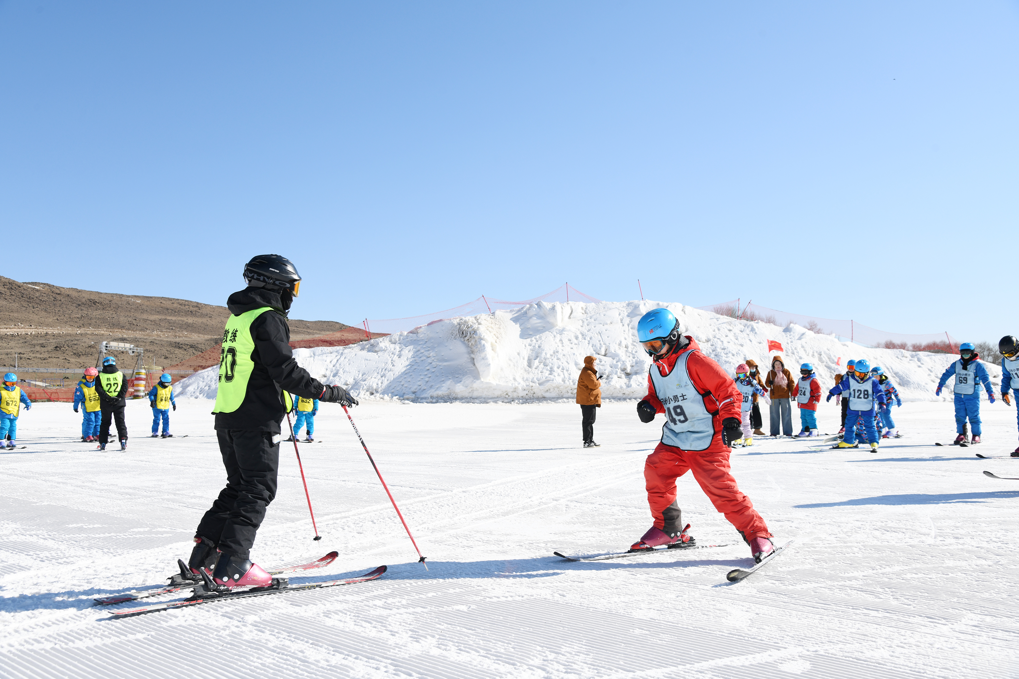 “把腳尖對準雪板凹槽,腳后跟用力下踩?!薄半p腿呈‘V’字形,與肩同寬,掌握好平衡?!倍顮I學員在烏蘭察布日光火山大河灣滑雪度假區(qū)專業(yè)教練的悉心指導下,從最基礎(chǔ)的穿戴裝備學起,逐漸掌握了犁式轉(zhuǎn)彎、半犁式轉(zhuǎn)彎等技巧。經(jīng)過一個多小時的學習和鍛煉,有一定基礎(chǔ)的學員已經(jīng)可以在雪道上腳踏雪板飛馳而下,并流暢地完成大回轉(zhuǎn)等動作;有的學員偶爾摔倒,也會迅速起身繼續(xù)訓練。