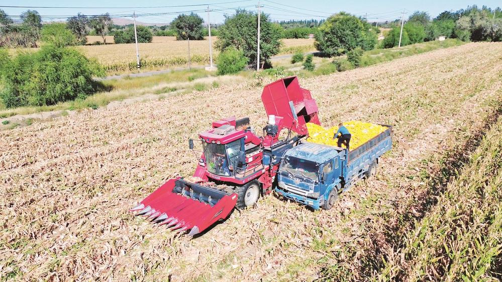 在烏達(dá)區(qū)烏蘭淖爾鎮(zhèn),農(nóng)機手駕駛收割機在農(nóng)田里收割玉米。