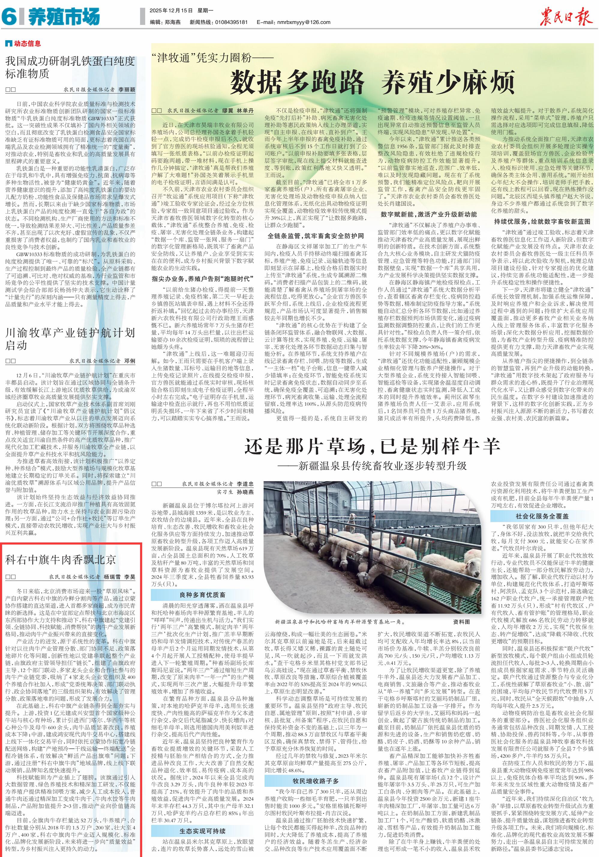 2025年12月15日《農(nóng)民日報(bào)》第6版刊發(fā)了《科右中旗牛肉香飄北京》的文章,報(bào)道了產(chǎn)自內(nèi)蒙古科右中旗的冷鮮分割肉等產(chǎn)品,通過京蒙協(xié)作搭建的直達(dá)渠道,進(jìn)入首都多家商超,成為市民青睞的新選擇。這是在中宣部定點(diǎn)幫扶與北京市海淀區(qū)東西部協(xié)作大力支持和推動下,科右中旗建起“黨建引領(lǐng)、全鏈協(xié)同、科技賦能、消費(fèi)幫扶”的肉牛產(chǎn)業(yè)發(fā)展新格局,為鄉(xiāng)村振興注入更持久的動力。