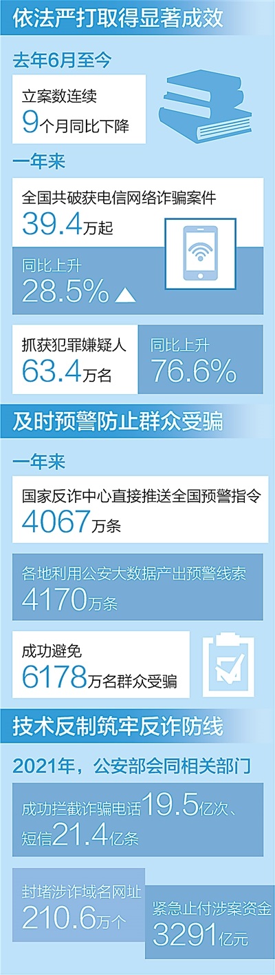 據(jù)介紹,全國(guó)公安機(jī)關(guān)深入開展“云劍”“長(zhǎng)城”“斷卡”“斷流”“5·10”等專項(xiàng)行動(dòng),先后組織開展150次全國(guó)集群戰(zhàn)役。一年來(lái),共破獲電信網(wǎng)絡(luò)詐騙案件39.4萬(wàn)起,抓獲犯罪嫌疑人63.4萬(wàn)名,同比分別上升28.5%和76.6%。根據(jù)最新統(tǒng)計(jì),電信網(wǎng)絡(luò)詐騙立案數(shù)連續(xù)9個(gè)月同比下降,打擊治理工作取得顯著成效。