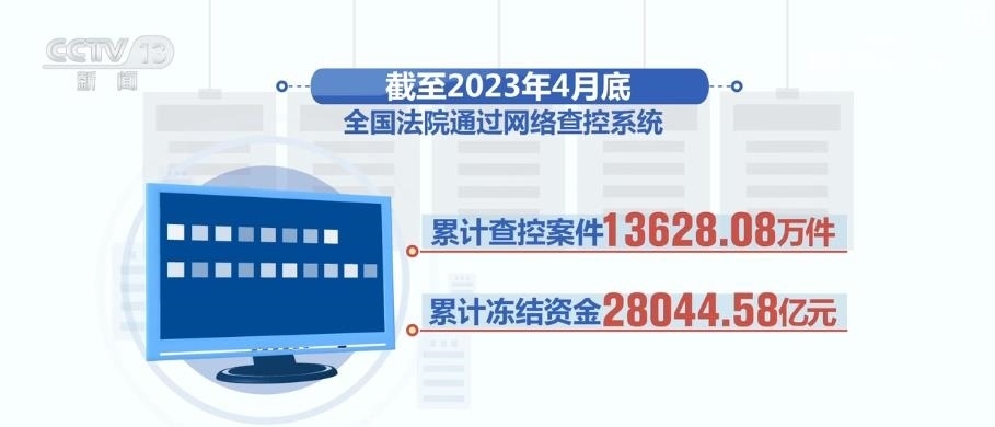 截至2023年4月底,全國法院通過網(wǎng)絡(luò)查控系統(tǒng)累計查控案件13628.08萬件,累計凍結(jié)資金28044.58億元,查詢房屋、土地等不動產(chǎn)信息81963.89萬條,車輛19018.00萬輛,證券42195.43億股,漁船和船舶371.79萬艘,網(wǎng)絡(luò)資金1009.75億元,有力維護了勝訴當(dāng)事人合法權(quán)益。
