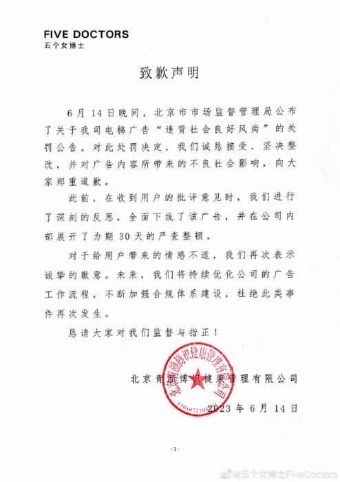 6月14日晚,“五個(gè)女博士”也在其微博發(fā)布致歉聲明稱,對此處罰決定,誠懇接受、堅(jiān)決整改,并對廣告內(nèi)容所帶來的不良社會(huì)影響,向大家鄭重道歉。