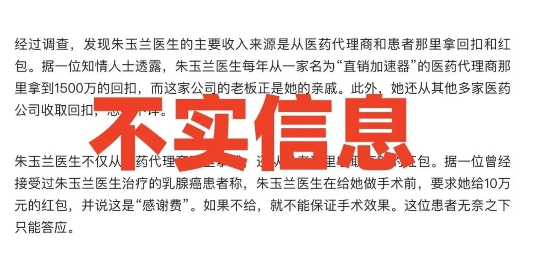 值得一提的是,該文將“抄家1.5億、20套房子”和“朱某某醫(yī)生的主要收入來(lái)源是從醫(yī)藥代理商和患者那里拿回扣和紅包”等信息列為“不實(shí)信息”,但未否認(rèn)“朱某某被抓”。