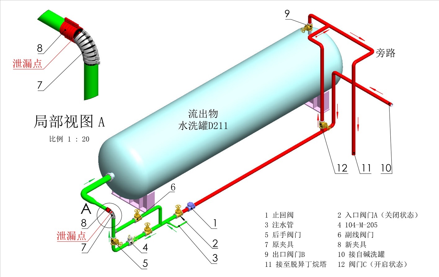 13時24分10秒,在新夾具兩側(cè)各安裝緊固1套螺栓時,原夾具水平端的管道焊縫處突然斷裂,大量介質(zhì)從斷口噴出?,F(xiàn)場監(jiān)護人員立即向外疏散并安排烷基化裝置內(nèi)操人員緊急停車。