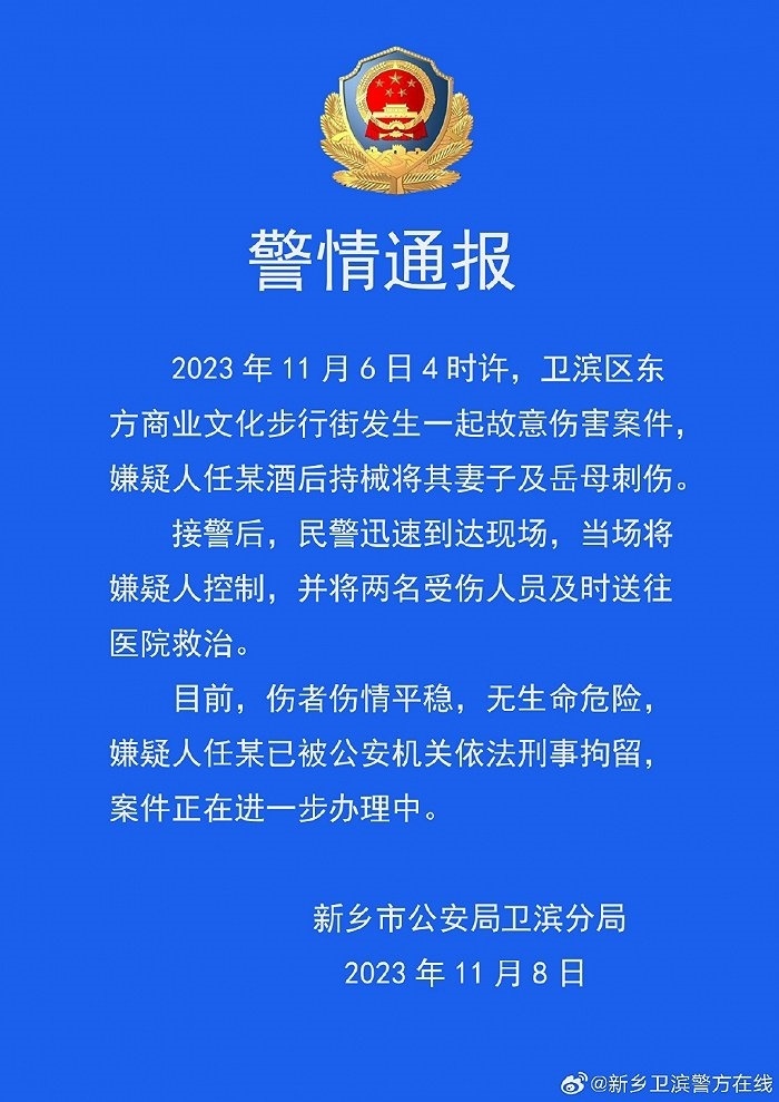 ·河南新鄉(xiāng)警方通報(bào):一男子酒后持械刺傷妻子及岳母,被刑事拘留。
