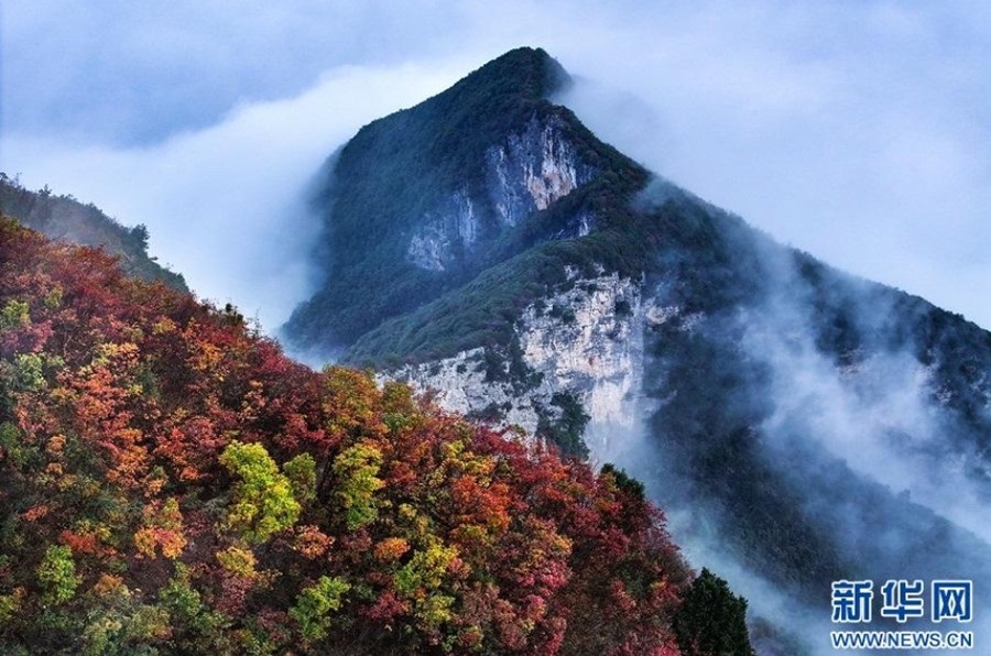 云霧繚繞,半山紅葉與半山青黛交相輝映。深秋時(shí)節(jié),三峽地區(qū)霜染秋葉,與青山綠水相映成趣。