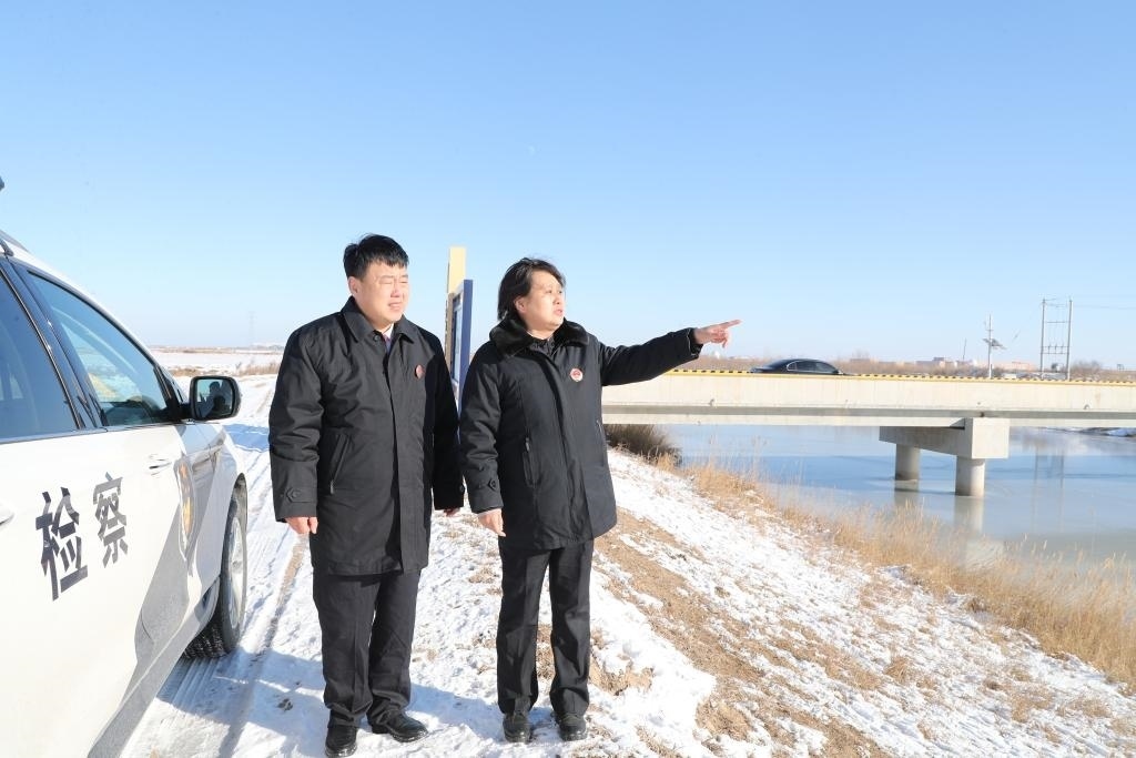 12月一場(chǎng)暴雪后,東營(yíng)區(qū)檢察院檢察官再次來(lái)到武家大溝堤壩檢查河道安全。(劉智峰 攝)