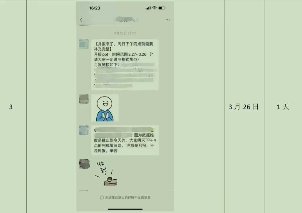 原告自訴,從2021年7月到11月離職前,自己一直是24小時待命工作,下班后仍在微信處理工作事務(wù),經(jīng)常工作到半夜,最晚的時候工作到凌晨兩點,公司還會半夜召開微信工作會議。微信加班已經(jīng)嚴(yán)重影響了自己的正常休息生活,超過了合同約定的工作時間。
