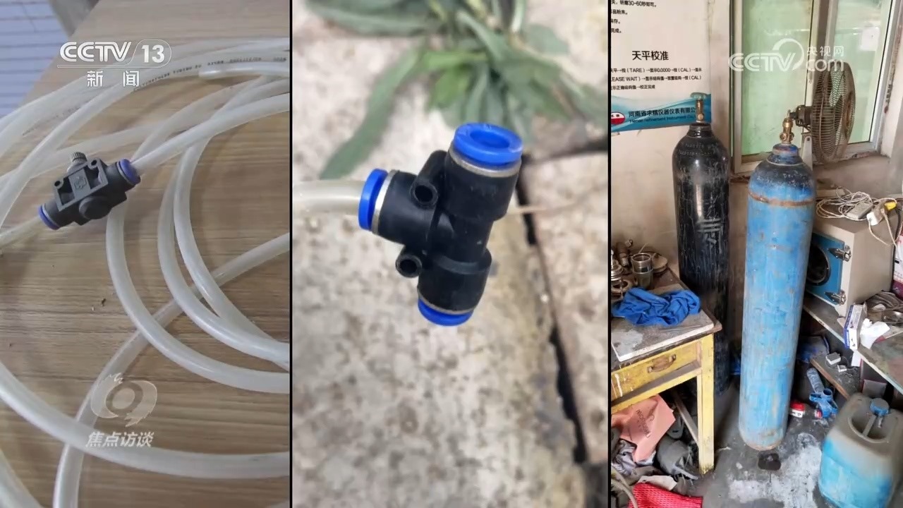 塑料軟管、三通管件、氮氣瓶,就是“環(huán)??萍脊尽钡娜藖斫o磚廠安裝的所謂“環(huán)保設(shè)備”,他們把氮氣接入采樣管線,稀釋采樣氣體,從而達到干擾在線監(jiān)測數(shù)據(jù)的目的。