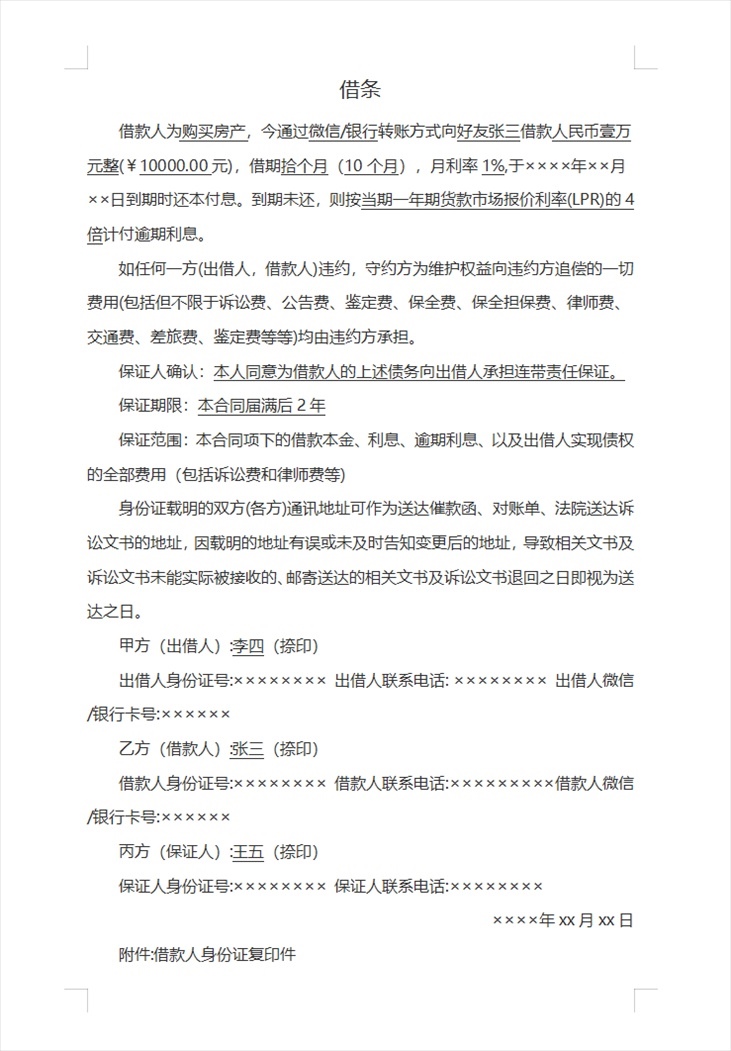 · 出借人信息:借條中要寫清出借人的全名及身份證號碼,否則一般認為借條持有人為權利人。