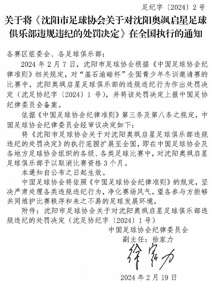 央視網(wǎng)消息:據(jù)中國足球協(xié)會2月21日發(fā)布通知,將《沈陽市足球協(xié)會關(guān)于對沈陽奧颯啟星足球俱樂部違規(guī)違紀(jì)的處罰決定》及《遼寧省足球運動協(xié)會關(guān)于對教練員吳高俊違規(guī)違紀(jì)的處罰決定》在全國執(zhí)行,具體內(nèi)容如圖: