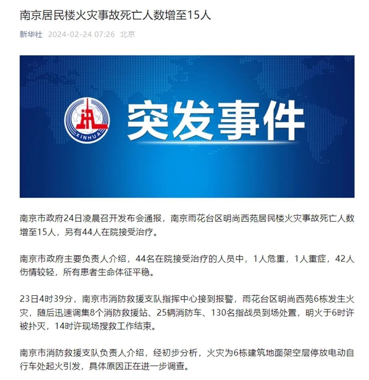 2月24日凌晨,南京市召開新聞發(fā)布會,通報雨花臺區(qū)“2·23”火災(zāi)事故有關(guān)情況。發(fā)布會上介紹,23日凌晨4時39分,南京市消防救援支隊指揮中心接到報警,雨花臺區(qū)明尚西苑6棟發(fā)生火災(zāi)。本次事故現(xiàn)場明火于當(dāng)日上午6時左右被撲滅,現(xiàn)場搜救工作于下午2時全部結(jié)束。截至23日24時,事故共造成15人遇難,44人在院治療,其中,1人危重,1人重癥,42人傷情較輕,所有患者生命體征平穩(wěn)。南京市消防救援支隊負(fù)責(zé)人介紹,經(jīng)初步分析,火災(zāi)為6棟建筑地面架空層電動自行車停放處起火引發(fā),具體原因正在進(jìn)一步調(diào)查。