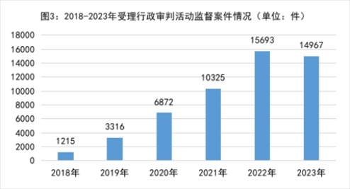 3.行政審判活動(dòng)監(jiān)督更有實(shí)效。2018年以來受理行政審判活動(dòng)監(jiān)督案件分別是:2018年1215件、2019年3316件、2020年6872件、2021年10325件、2022年15693件,年均增加89.6%。經(jīng)過連續(xù)五年監(jiān)督,監(jiān)督效果初步體現(xiàn)。2023年共受理14967件,同比下降4.6%。其中,依職權(quán)受理占95.5%;依申請(qǐng)受理占4.5%。針對(duì)超期立案、超期審理、違反規(guī)定送達(dá)法律文書等審判程序違法問題,向法院提出檢察建議13491件,同比下降6.8%。