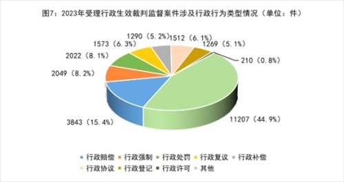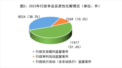 5.行政爭議實(shí)質(zhì)性化解持續(xù)深化做實(shí)。針對(duì)司法實(shí)踐中一些行政案件程序已結(jié)但訟爭未解的“程序空轉(zhuǎn)”“案結(jié)事不了”等問題,2023年共促進(jìn)案涉行政爭議實(shí)質(zhì)性化解22310件,同比上升26%。其中,行政生效裁判監(jiān)督案件8524件,占38.2%;行政審判活動(dòng)監(jiān)督案件2269件,占10.2%;行政執(zhí)行活動(dòng)(含非訴執(zhí)行)監(jiān)督案件11517件,占51.6%。