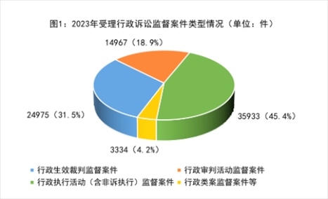 1.行政檢察監(jiān)督職能全面發(fā)展。一方面,訴訟內(nèi)監(jiān)督進(jìn)一步強(qiáng)化。2023年全國檢察機(jī)關(guān)共受理行政訴訟監(jiān)督案件79209件,其中,行政生效裁判監(jiān)督案件24975件,占比31.5%;行政審判活動(dòng)監(jiān)督案件14967件,占比18.9%;行政執(zhí)行活動(dòng)(含非訴執(zhí)行)監(jiān)督案件35933件,占比45.4%;行政類案監(jiān)督等案件3334件,占比4.2%。另一方面,“訴訟外”監(jiān)督實(shí)現(xiàn)新突破。2023年辦理行刑反向銜接案件中對(duì)被不起訴人應(yīng)受行政處罰的提出檢察意見11.3萬人,辦理行政違法行為監(jiān)督案件提出檢察建議3.2萬件。行政檢察各項(xiàng)職能發(fā)展更加全面、更加協(xié)調(diào)。針對(duì)行政訴訟、行政執(zhí)法和執(zhí)行活動(dòng)存在的問題,以抗訴、檢察建議等方式提出監(jiān)督意見17.4萬件。