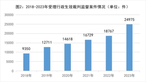 2.行政生效裁判監(jiān)督力度加大,質(zhì)效向好。2018年以來辦理行政生效判決、裁定、調(diào)解書監(jiān)督案件分別是:2018年9350件、2019年12711件、2020年14618件、2021年16729件、2022年18767件、2023年24975件,年均增加21.7%。2023年辦理數(shù)同比上升33.1%,較2018年上升1.7倍。其中,依申請(qǐng)辦理占90.5%;依職權(quán)辦理占9.5%。對(duì)認(rèn)為確有錯(cuò)誤的生效裁判,提出抗訴192件,同比上升17%,同期法院審結(jié)改變率82.2%,同比增加2.9個(gè)百分點(diǎn);提出再審檢察建議432件,同期法院采納率為91.7%,同比增加18.4個(gè)百分點(diǎn);同步向行政機(jī)關(guān)提出檢察建議6900件,占提出監(jiān)督意見數(shù)的91.7%。