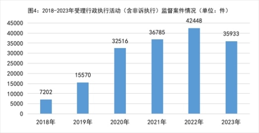 4.行政執(zhí)行活動(dòng)監(jiān)督發(fā)展迅速,行政非訴執(zhí)行監(jiān)督占主導(dǎo)。2018年以來受理行政執(zhí)行活動(dòng)(含非訴執(zhí)行)監(jiān)督案件分別是:2018年7202件、2019年15570件、2020年32516件、2021年36785件、2022年42448件,年均增加55.8%。2023年受理35933件,同比下降15.3%。其中,行政非訴執(zhí)行活動(dòng)監(jiān)督34938件,占97.2%;行政訴訟執(zhí)行活動(dòng)監(jiān)督995件,占2.8%。針對(duì)超期執(zhí)行、執(zhí)行裁定或決定違反法定程序、違法裁定終結(jié)本次執(zhí)行、怠于申請(qǐng)強(qiáng)制執(zhí)行等問題,向法院、行政機(jī)關(guān)提出檢察建議31790件,同比下降12.8%。