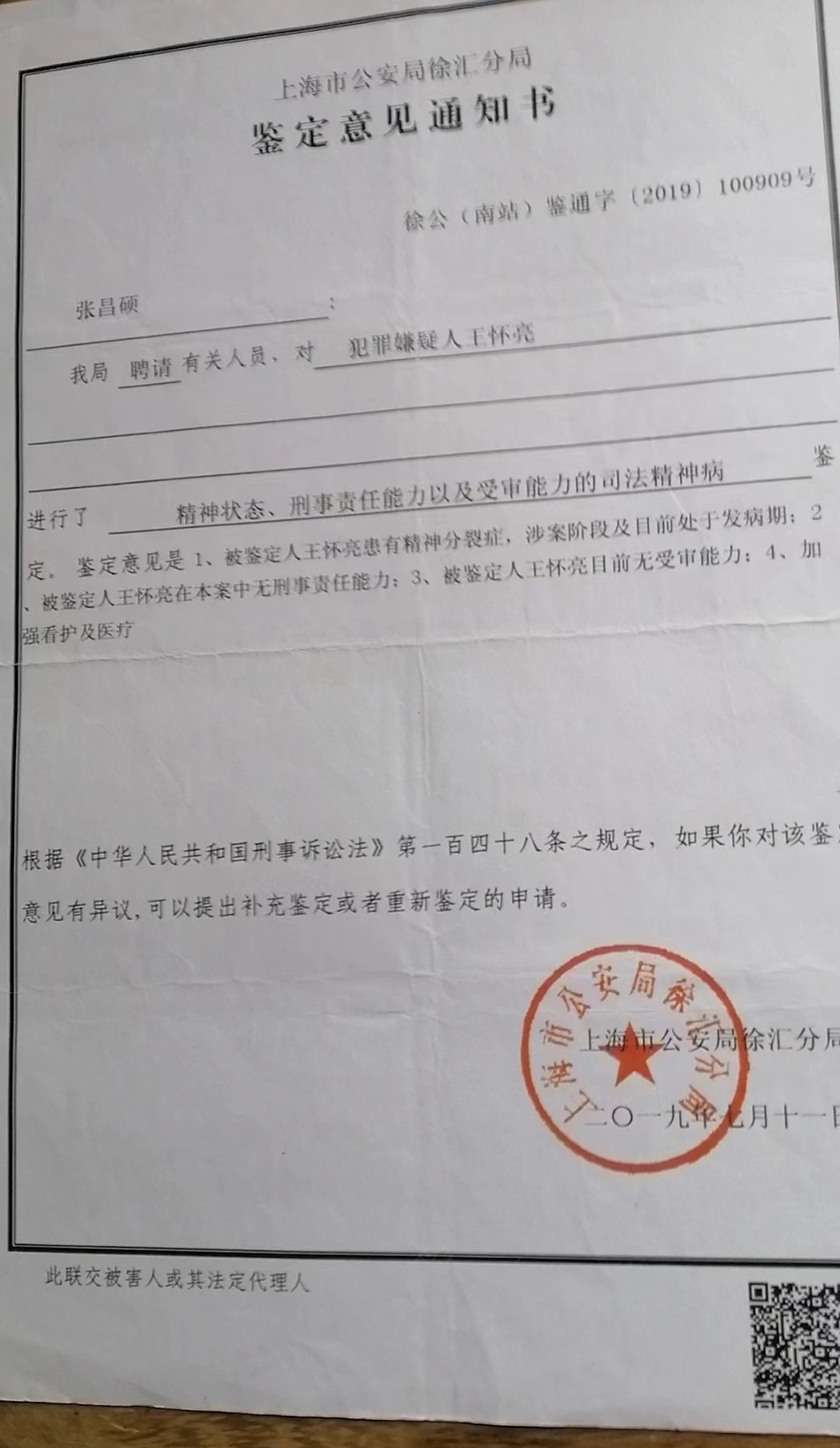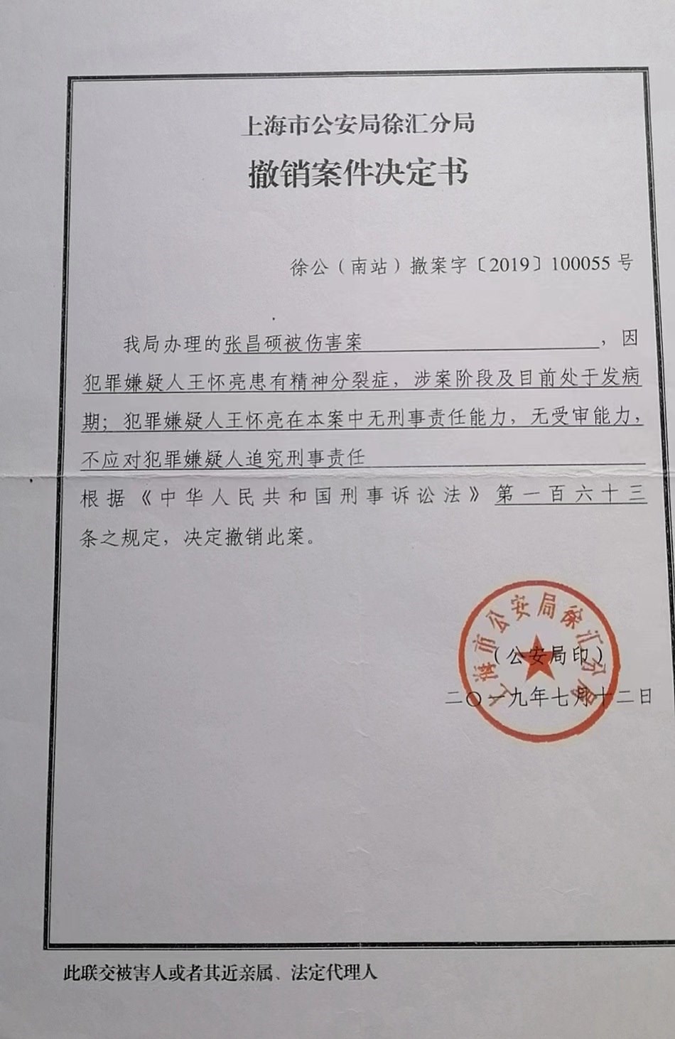 張宏銀回憶,他已經(jīng)不記得這起依法不負(fù)刑事責(zé)任的精神病人強(qiáng)制醫(yī)療程序案件開(kāi)庭審理的具體時(shí)間,只記得是2019年下半年的一天上午,那天犯罪嫌疑人沒(méi)有到場(chǎng),律師也沒(méi)有到場(chǎng),檢察院的兩位人員出席了開(kāi)庭。徐匯區(qū)法院當(dāng)庭做出判決:王懷亮被送往醫(yī)療機(jī)構(gòu)進(jìn)行強(qiáng)制醫(yī)療。2019年7月12日,張宏銀收到公安局的撤銷(xiāo)案件決定書(shū)。