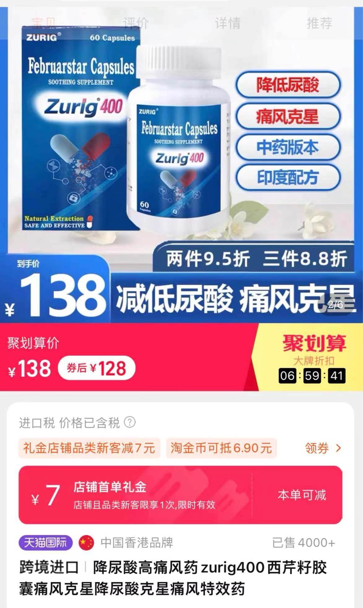 此外,zurig400在銷售頁面還模仿印度zurig80,宣稱降尿酸、痛風藥。澎湃新聞記者調(diào)查發(fā)現(xiàn),zurig400目前在多個網(wǎng)購平臺有售,有商家顯示已出售4000+。 經(jīng)了解后得知,印度zurig80實際上是一款仿制藥,目前國內(nèi)并未獲批上市;而zurig400卻是一款香港產(chǎn)的保健品類目產(chǎn)品,并非藥品。但產(chǎn)品宣傳時卻使用“痛風特效藥”“印度配方”“中藥非布”等詞語,讓患者產(chǎn)生誤會。