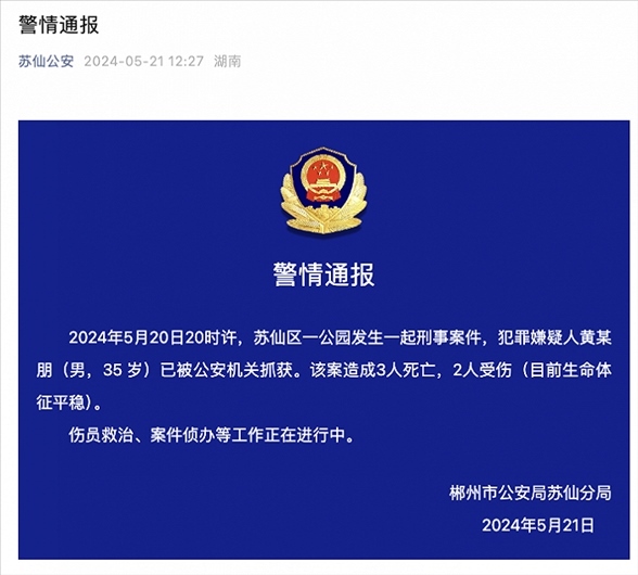央視網(wǎng)消息:據(jù)蘇仙公安微信公眾號(hào)消息,5月20日20時(shí)許,蘇仙區(qū)一公園發(fā)生一起刑事案件,犯罪嫌疑人黃某朋(男,35歲)已被公安機(jī)關(guān)抓獲。該案造成3人死亡,2人受傷(目前生命體征平穩(wěn))。傷員救治、案件偵辦等工作正在進(jìn)行中。