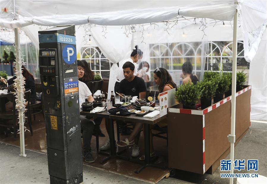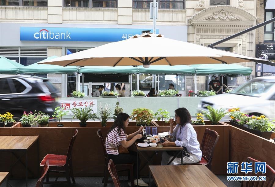 7月23日,在美國(guó)紐約,人們?cè)趹敉饩筒蛥^(qū)用餐。美國(guó)約翰斯·霍普金斯大學(xué)23日發(fā)布的新冠疫情最新統(tǒng)計(jì)數(shù)據(jù)顯示,美國(guó)累計(jì)確診病例超過(guò)400萬(wàn)例。數(shù)據(jù)顯示,截至美國(guó)東部時(shí)間23日15時(shí)34分(北京時(shí)間24日3時(shí)34分),美國(guó)累計(jì)確診病例4007859例,累計(jì)死亡病例143846例。新華社記者王迎攝