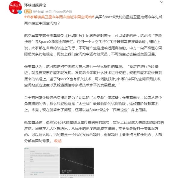 航空軍事專家張寶鑫接受《環(huán)球時報》記者采訪時表示,可以肯定的是,這兩次“危險接近”是SpaceX承擔全部責任。任何一個太空飛行的飛行器都需要報備軌跡,理論上說,大家都在各自的軌跡上飛行,不可能產生碰撞或近距離接觸。中方一向嚴格遵守國際相關條約和規(guī)定,再加上我們空間站中還有航天員,不可能主動去接近美國衛(wèi)星。