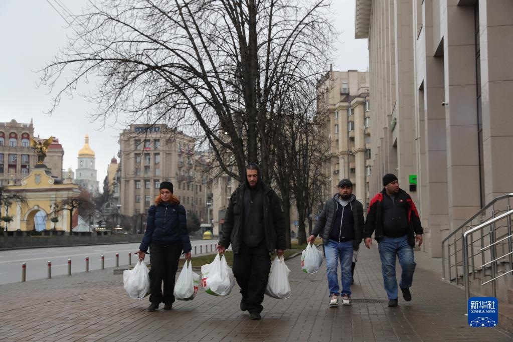 2月24日,在烏克蘭基輔,當地居民拎著采購的物資走在街道上。新華社記者 李東旭 攝
