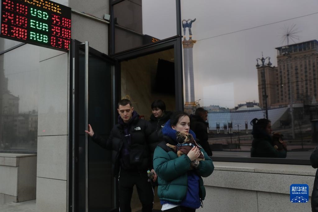 2月24日,在烏克蘭基輔,當地居民從一處換匯點離開。新華社記者 李東旭 攝