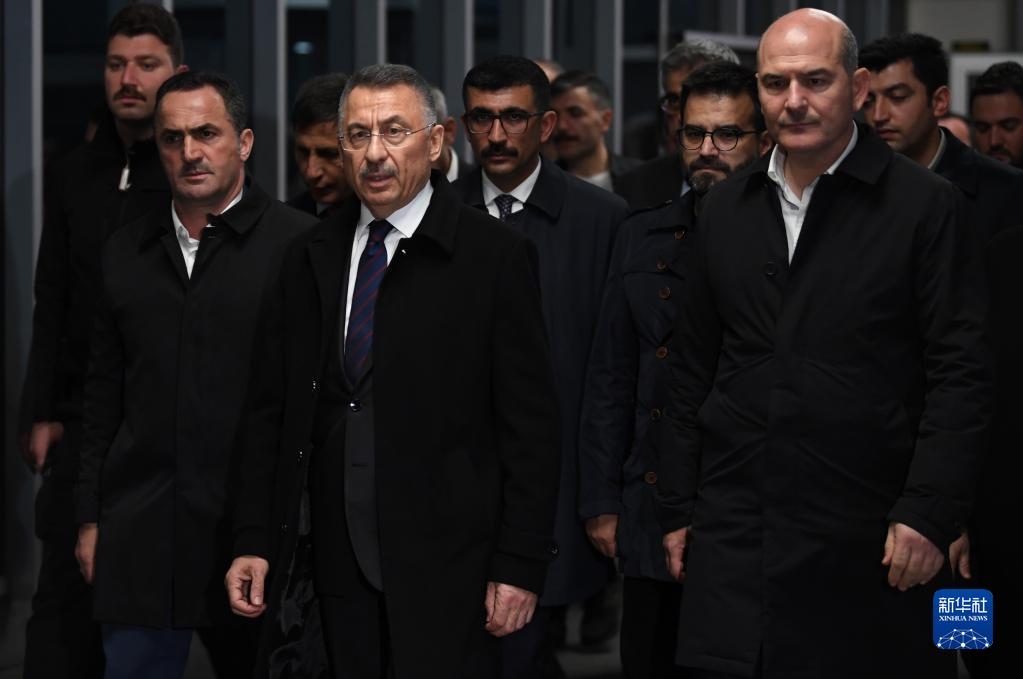 11月13日,在土耳其伊斯坦布爾,土耳其副總統(tǒng)奧克塔伊(中)和其他政府官員從塔克西姆廣場附近的一家醫(yī)院走出。新華社記者沙達(dá)提攝