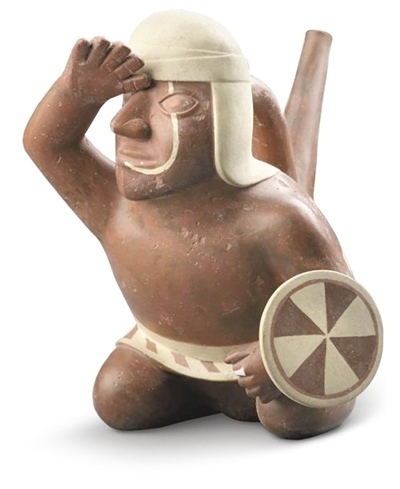 在展廳醒目位置,擺放著一件莫切文明時(shí)期(公元100年—800年)的戰(zhàn)士陶器,他皮膚深褐、高眉大眼、神情堅(jiān)毅,腰間系著白色外衣,頭上戴著布帽。這名戰(zhàn)士身體微微前傾,跪坐在地,左手持盾牌,右手搭于額前,向著遠(yuǎn)方眺望。這件戰(zhàn)士陶器身高雖不足20厘米,卻體態(tài)生動(dòng),僅使用簡(jiǎn)練的線(xiàn)條與棕白兩色,便將一位莫切戰(zhàn)士形象刻畫(huà)得活靈活現(xiàn)。在雷瓜伊文明時(shí)期(公元前200年—公元650年)的動(dòng)物陶器展臺(tái)前,總是有不少孩童圍繞。兇猛的美洲虎、呆萌的羊駝、神秘的未知生物,各種陶器與石器器身僅用黑、紅、白三色裝飾,形態(tài)各異、生動(dòng)活潑,透過(guò)玻璃柜懵懂地望向千年后的小觀眾們。