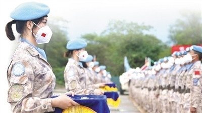 2022年9月30日,中國第八批赴南蘇丹(朱巴)維和步兵營700名維和官兵被聯(lián)合國授予“和平榮譽(yù)勛章”,以表彰他們?cè)趫?zhí)行維和任務(wù)期間的卓越表現(xiàn)和為南蘇丹和平事業(yè)作出的突出貢獻(xiàn)。圖為授勛儀式現(xiàn)場。 孫雪松攝(新華社發(fā))