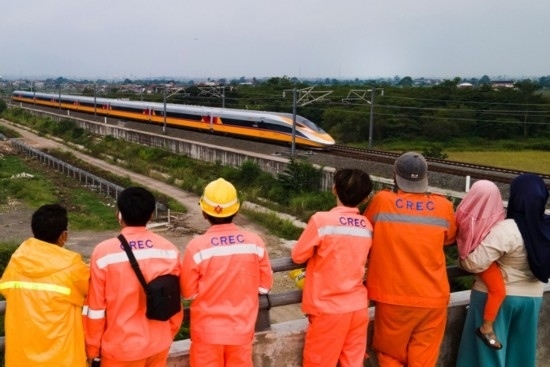 2022年11月16日,在印度尼西亞萬隆,雅萬高鐵建設(shè)者和當(dāng)?shù)孛癖娪^看高速鐵路綜合檢測車行駛在雅萬高鐵試驗(yàn)段(無人機(jī)照片)。新華社發(fā)(李培養(yǎng) 攝)