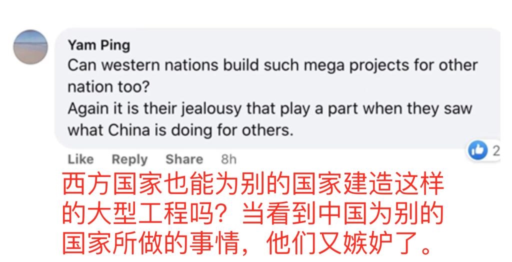網(wǎng)友亞姆·平說:“西方國家也能為別的國家建造這樣的大型工程嗎?當看到中國為別的國家所做的事情,他們又嫉妒了。”
