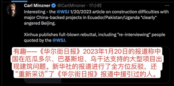 美國福特漢姆大學教授、美國外交關(guān)系協(xié)會中國問題高級研究員明克勝轉(zhuǎn)發(fā)了新華社的報道,并稱:有趣——《華爾街日報》2023年1月20日的報道稱中國在厄瓜多爾、巴基斯坦、烏干達支持的大型項目出現(xiàn)建筑問題。新華社的報道進行了全方位反駁,還“重新采訪”了《華爾街日報》報道中援引過的人。