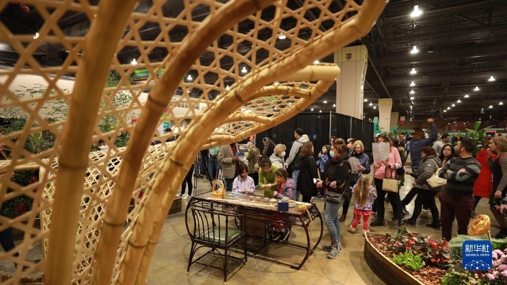 3月4日,在美國費(fèi)城花展上,孩子們現(xiàn)場體驗(yàn)中國傳統(tǒng)竹編。新華社記者 張墨成 攝