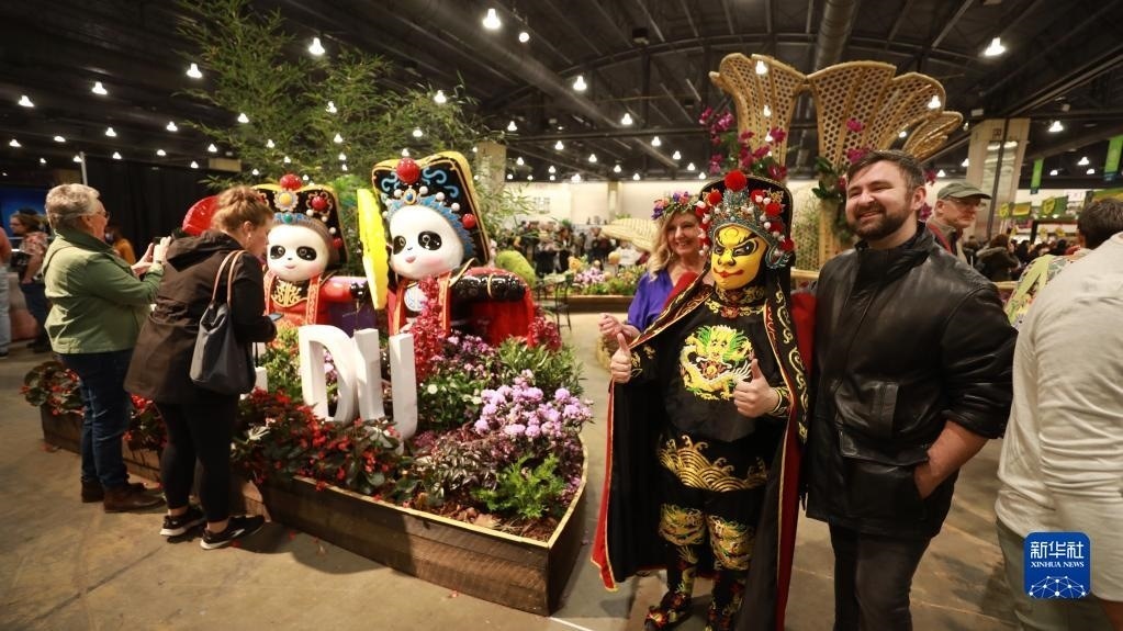 3月4日,在美國費(fèi)城花展上,人們在成都展園入口處的“川劇熊貓”造型前拍照。新華社記者 張墨成 攝