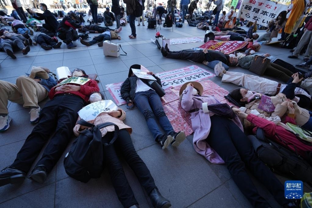 當(dāng)日,300多名民眾聚集在會展中心門前,高喊“拒絕為戰(zhàn)爭準(zhǔn)備”“拒絕死亡商人”“反對戰(zhàn)爭”等口號強烈抗議日本強化武器交易??棺h演講之后,民眾還集體倒地,以行為語言以示抗議。