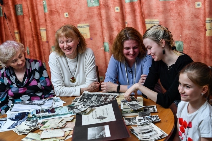 3月9日,援華專家西林之女葉蓮娜 (左一)和家人在接受新華社記者采訪時,一起翻看老照片。新華社記者曹陽攝