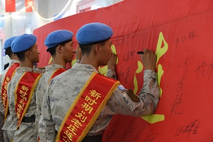 在今年的活動中,維和官兵與江蘇淮陰和部隊營區(qū)舉行了三地視頻連線。任務區(qū)官兵首先向劉老莊當?shù)厝嗣駞R報了連隊執(zhí)行維和任務的情況。國內連隊官兵代表在江蘇省淮安市淮陰區(qū)劉老莊連紀念園與維和連隊遠程連線,共話感受。連隊還為新評選的“新時代劉老莊連八十二勇士”頒發(fā)了證書獎章,并舉行了“勇士旗”簽字儀式。