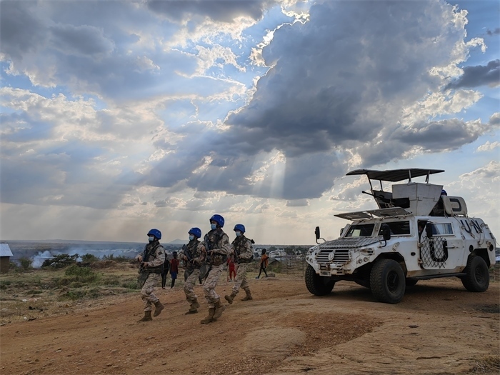2022年12月,“劉老莊連”隨中國第九批赴南蘇丹(朱巴)維和步兵營奔赴維和戰(zhàn)場,重點擔負警戒巡邏、武裝護衛(wèi)、隔離沖突等維和任務。截至目前,“劉老莊連”累計行程1500余公里,高標準完成了各項授權任務,受到聯(lián)南蘇團各級高度贊揚。這也是英雄的“劉老莊連”戰(zhàn)旗第一次飄揚在非洲大地。